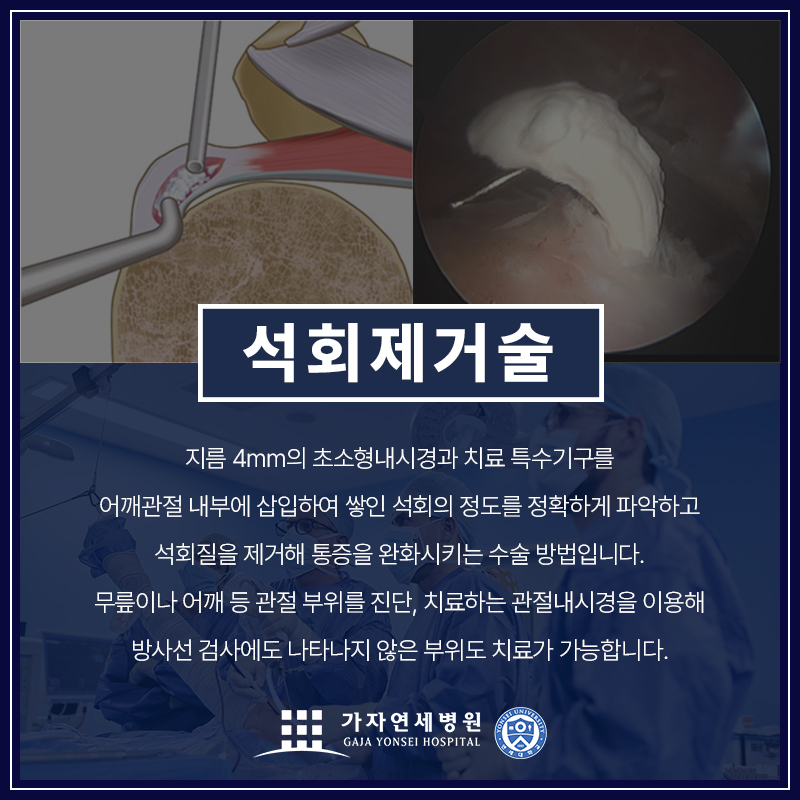 수술적 치료로는 관절경적 석회 제거술이 있습니다. 관절경적 석회 제거술은 관절내시경으로 최소절개를 통해 4mm 내시경과 특수기구를 삽입하여 관절 내부를 실시간 모니터링으로 문제를 파악하고 어깨에 쌓인 석회질을 찾아 제거하는 수술입니다.