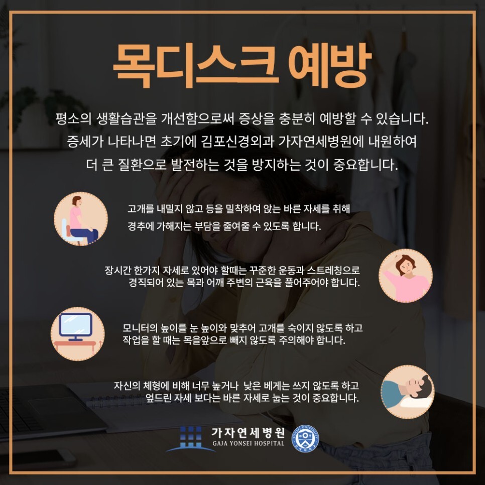 목디스크는 평소의 생활습관을 개선함으로써 증상을 충분히 예방할 수 있습니다. 무엇보다 중요한 것은 이상 증세가 나타나면 초기에 김포신경외과 가자연세병원에 내원하여 더 큰 질환으로 발전하는 것을 방지하는 것입니다. 예방과 초기 발견을 통해 목 건강을 오래 유지하기를 바라겠습니다.