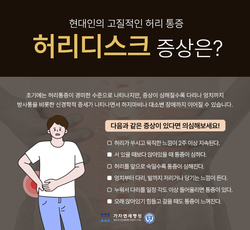 반복적으로 잘못된 자세를 취한다면 허리에서 통증이 느껴질 수 있습니다. 허리에서 나타나는 허리 질환 중 허리디스크는 가장 대표적이라고 할 수 있는데요. 현대인들에 있어 매우 고질적인 질환입니다. 이번 시간 가자연세병원 김포점에서 소개해 드릴 질환은 김포허리디스크입니다.