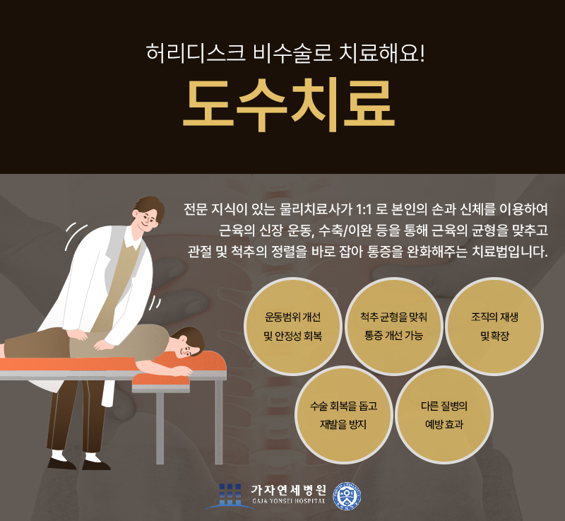 초기에 허리디스크를 의심하고 빠른 치료가 시행될 때 더욱 빠른 회복을 기대할 수 있습니다. 초기 허리디스크의 경우 비수술적 치료와 생활 습관 개선을 병행하면 통증 감소와 더불어 회복까지 가능합니다. 비수술적 치료에는 약물치료, 물리치료, 주사치료, 도수치료 등이 있으며 이번 시간 가자연세병원에서는 도수치료에 대해 알려드리겠습니다.