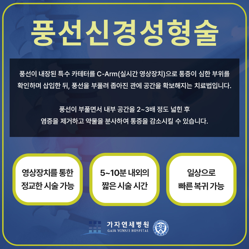 풍선 신경성형술은 풍선이 장착되어 있는 특수 카테터를 실시간 영상 장치로 통증이 심한 부위를 확인하여 삽입한 뒤, 풍선을 내부에서 부풀려 통증 유발 부위에 공간을 확보해 주는 비수술적 치료 방법입니다. 풍선이 부풀게 되면 내부 공간이 2~3배 정도 넓어지는데 그때 염증을 제거하고 약물을 분사하여 통증을 감소시킵니다. 이 시술은 당일 퇴원뿐 아니라 일상생활까지 즉시 가능하다는 장점이 있습니다. 다른 기저질환을 앓고 있더라도 적용이 가능하기에 증상이 의심되면 방치하지 말고 가까운 병원에 내원하여 꼼꼼히 진단받고 적절한 치료를 진행하기를 바라겠습니다.