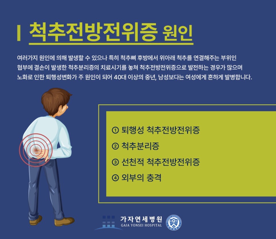 척추전방전위증은 노화로 인한 퇴행성 변화로 발생하는 것이 대다수였어요. 퇴행성 변화로 서서히 척추 마디가 약해지면서 작은 충격에서 손상을 입곤 하는데요. 그렇기 때문에 다른 척추 질환을 앓고 있는 경우 합병증으로 나타나기도 했어요. 그뿐만 아니라 허리를 무리하게 사용하거나 잘못된 자세를 장시간 취하는 경우, 외부에서 충격을 받는 경우에도 발병 가능성이 있기에 주의가 필요했어요.