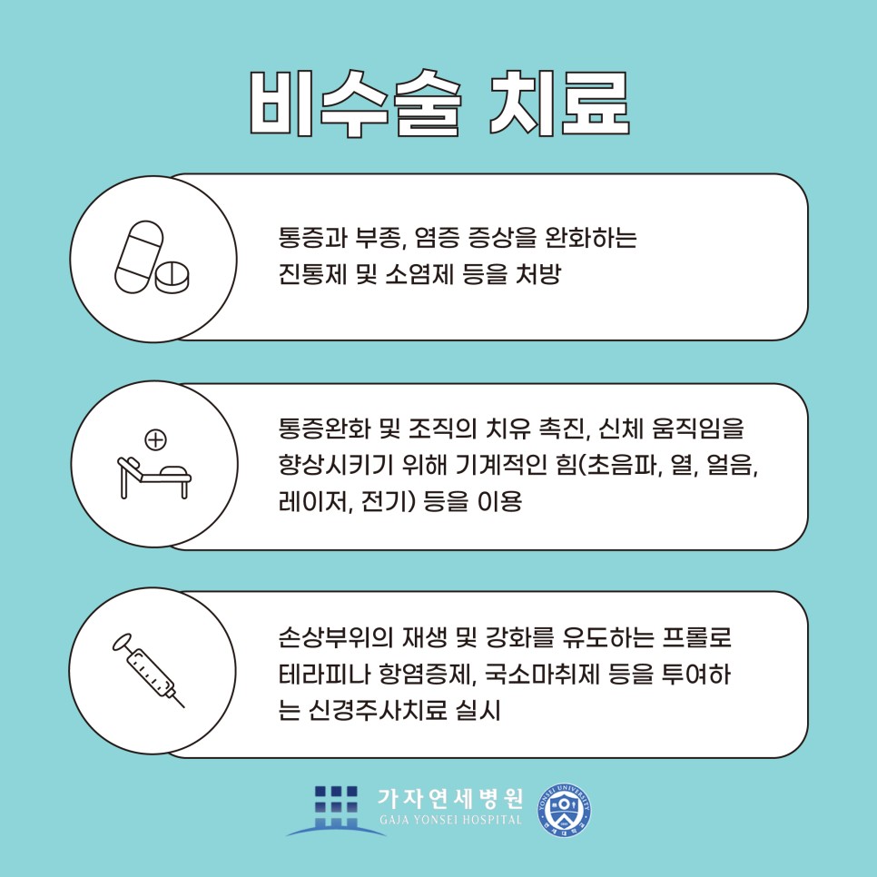 김포시에서 허리디스크 치료하는 가자연세병원에서는 먼저 비수술치료법으로 치료합니다. 통증과 부종, 염증 증상을 완화하는 진통제 및 소염제를 처방하는 약물치료부터 합니다. 또한 손상 부위의 재생 및 강화를 유도하는 프롤로테라피나 손상된 신경에 항염증제, 국소마취제 등을 투여하는 신경주사치료법을 실시합니다. 물리치료로는 통증완화 및 조직의 치유 촉진, 신체 움직임을 향상시키기 위해 열이나 얼음, 레이저, 초음파, 전기, 기계적인 힘등을 이용합니다.