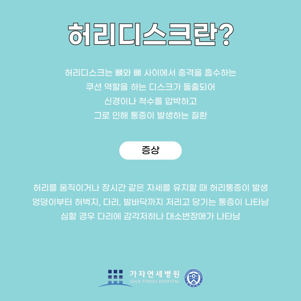 허리디스크는 뼈와 뼈 사이에서 충격을 흡수하는 쿠션 역할을 하는 디스크가 돌출되어 신경이나 척수를 압박하고 그로 인해 통증이 발생하는 질환입니다.