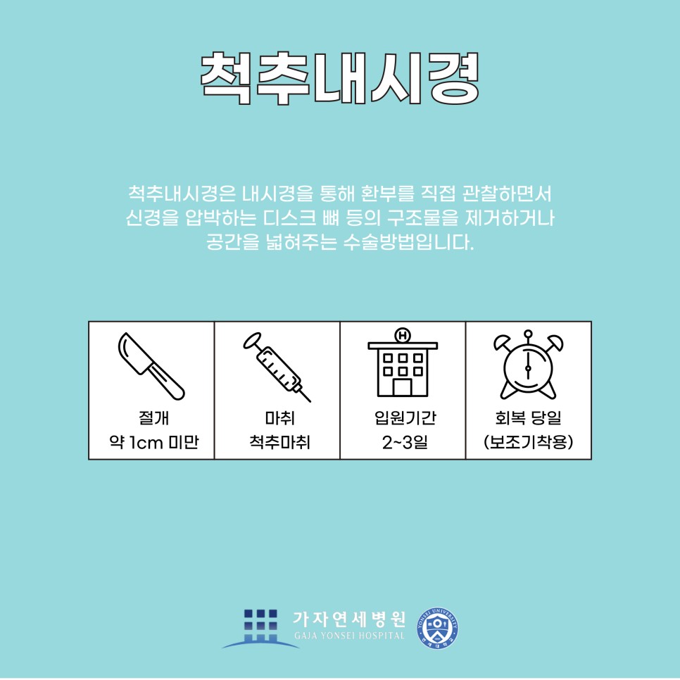 이러한 비수술치료에도 나아지지 않으면 척추내시경을 합니다. 척추내시경은 내시경을 통해 환부를 직접 관찰하면서 신경을 압박하는 디스크 뼈 등의 구조물을 제거하거나 공간을 넓혀주는 수술방법입니다. 약 1cm미만 절개하고 척추를 마취하여 입원을 2~3일간 합니다. 회복기간은 보조기 착용하고 수술당일 보행이 가능합니다.