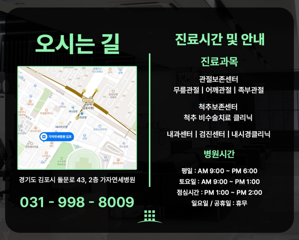 사우역정형외과 김포가자연세병원은 정밀한 진단 및 이에 적절한 치료를 제시하여 환자 분의 증상에 대한 호전을 기대하고 있으며 퇴원 후에도 체계적인 프로그램을 통해 통증으로 인해 저하된 삶의 질까지 고려하여 치료를 진행하고 있으니 내원 후 상담 받아 보시는 것을 바라겠습니다.