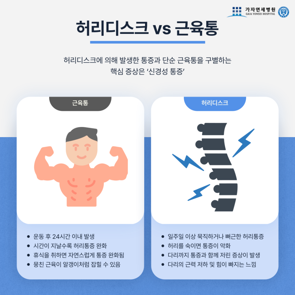개개인마다 허리디스크와 근육통으로 인해 발생하는 증상에 대해 유사한 점도 있을 수 있기 때문에 본인 스스로 진단을 하는 것은 매우 위험하다고 해요. 단순한 근육통이라도 골반에서 증상이 나타날 수 있으며, 초기 허리디스크에서는 방사통이 나타나지 않을 수 있다고 하는데요.