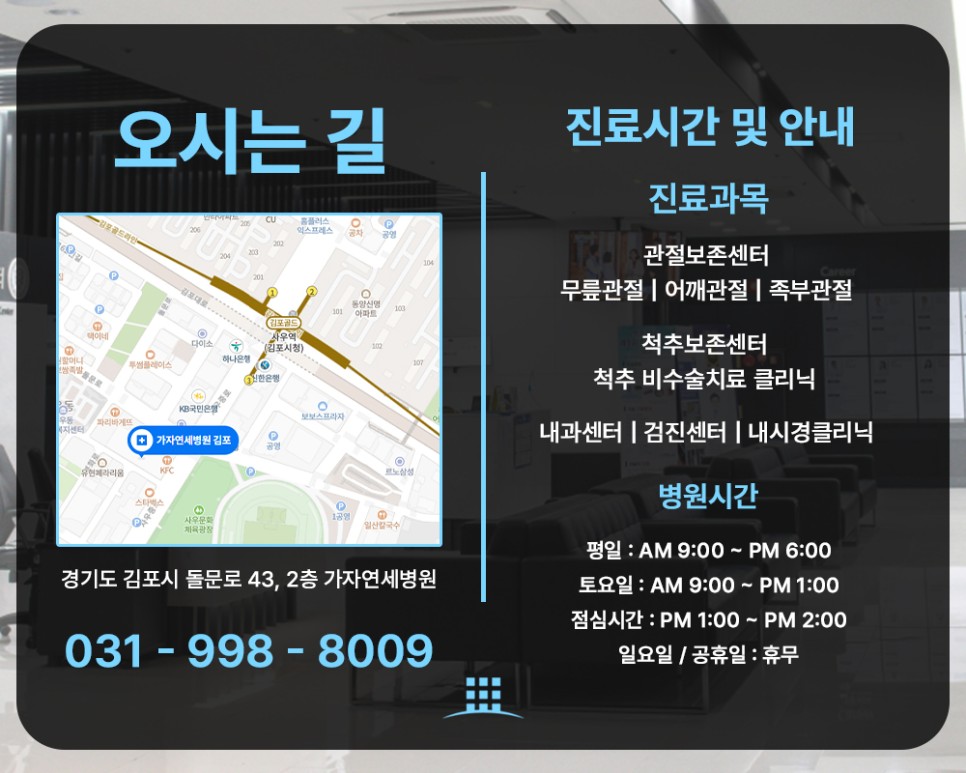 좌식 생활, 의자에 오래 앉아 장시간 업무 등의 요인으로 인해 가장 흔하게 느낄 수 있는 증상 중 하나는 허리통증이라고 해요. 그렇기 때문에 질환을 의심하지 않고 방치하여 악화된 후 김포허리디스크 치료하는 김포가자연세병원에 내원하시는 경우도 적지 않습니다.