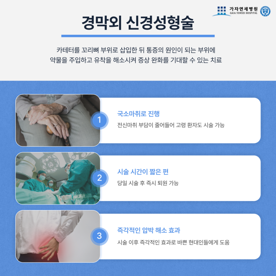 하지만 이러한 치료에도 통증이 지속되는 경우라면 신경성형술과 같은 보다 적극적인 시술을 고려할 수 있습니다. 특수 카테터를 꼬리뼈 부위로 삽입하여 영상장비를 이용하여 병변 부위까지 도달하게 한 뒤 약물을 주입하여 유착을 해소시켜 증상의 완화를 기대할 수 있는 방법으로 당일 시술로 인해 즉각적인 압박 해소를 기대할 수 있어 빠른 일상복귀가 가능하다는 장점이 있습니다.