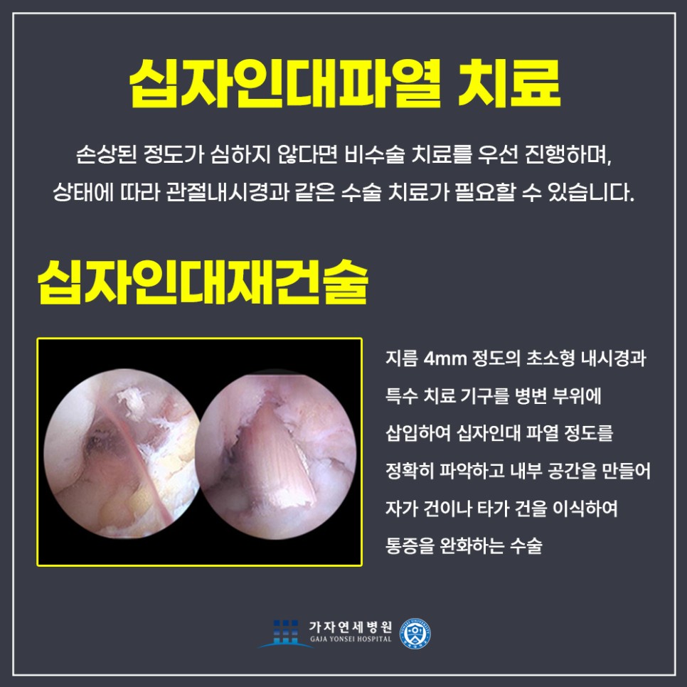 파열된 범위가 넓지 않고, 나타나는 불안정성도 심하지 않다면 보조기 등을 착용하여 안정성을 유지하며 약물치료, 물리치료, 주사치료 등의 보존적인 치료방법을 통해 염증 및 통증을 완화하고 관절의 기능 개선을 기대해 볼 수 있다고 해요.