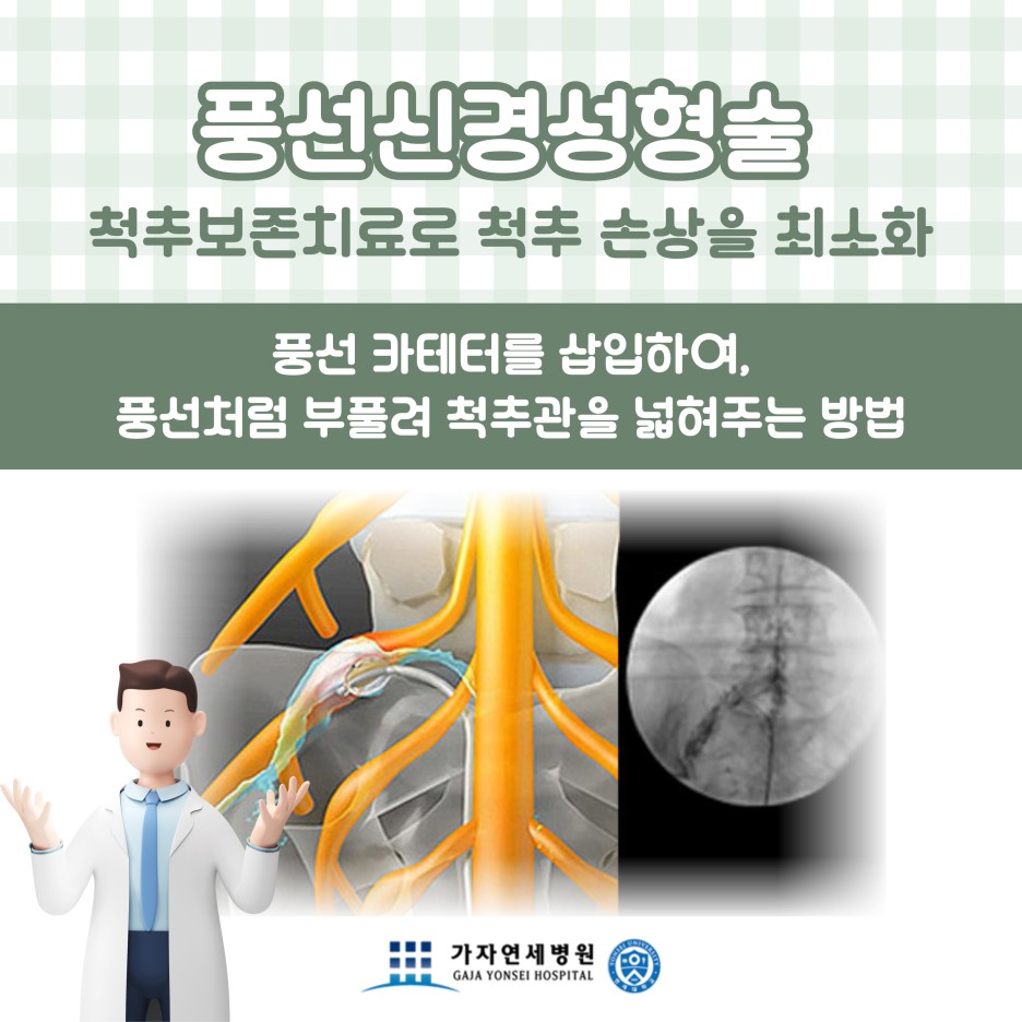 풍선신경성형술은 척추를 보존하는 비수술적 치료방법으로 풍선이 내장된 특수 카테터를 협착이 심한 부위까지 삽입 후, 풍선처럼 부풀려 좁아진 척추관을 넓혀주는 방법이에요. 삽입된 풍선이 부풀면서 내부 공간을 2~3배 정도 넓혀주는데, 이때 염증을 제거하고 약물을 삽입하여 통증을 완화시켜준답니다. 전신마취가 아닌 국소마취를 진행하며 30분 내외의 짧은 수술시간으로 바쁜 현대인에게 꼭 맞는 치료방법이에요,
