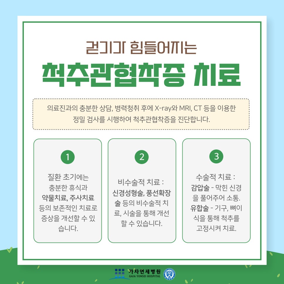 김포시청정형외과 가자연세병원김포점에서는 엑스레이 등의 정밀검사를 통해 환자분 척추의 상태를 정확하게 검진하고 세밀하게 살펴 적합한 치료방법을 권해드리고 있는데요, 척추관협착증의 상태가 심하지 않은 정도라면 수술적치료 이전에 주사치료, 물리치료, 도수치료, 풍선 신경성형술 등을 진행하고 있어요.