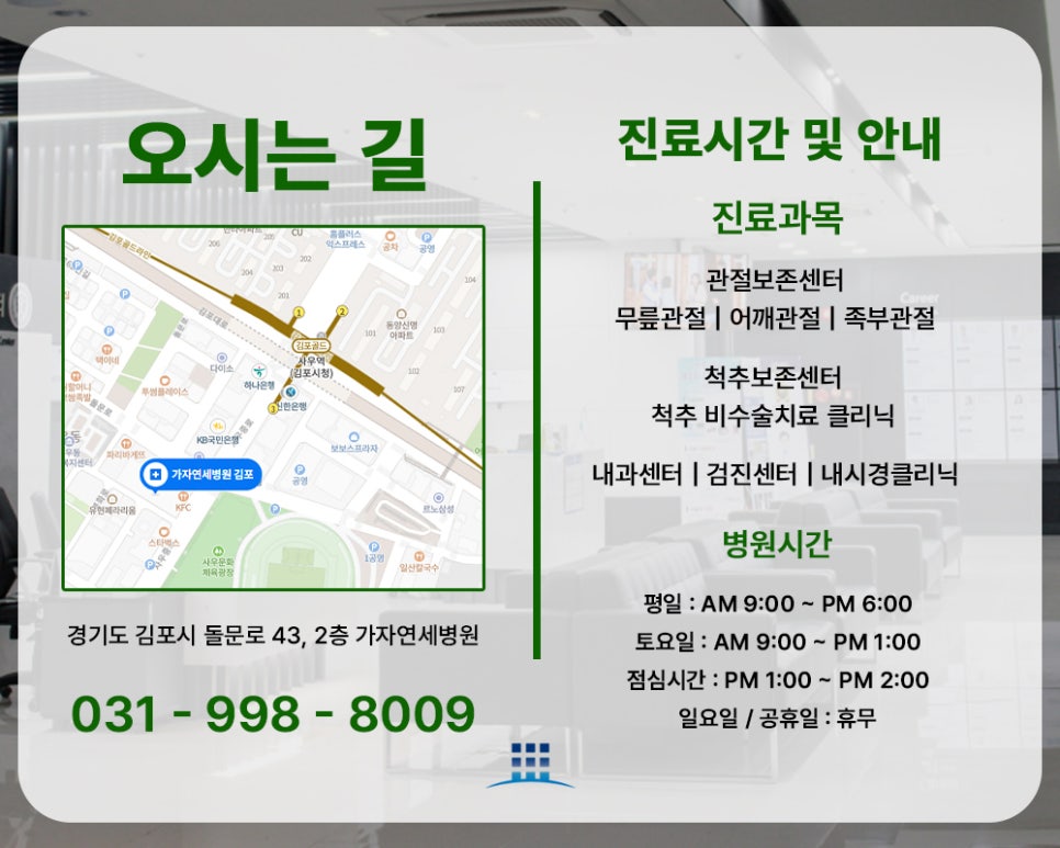 안녕하세요. 김포시청정형외과 가자연세병원 김포점입니다.