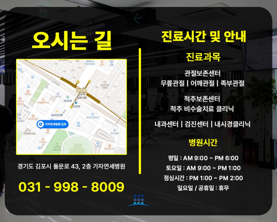 또한, 통증이 경미한 경우라도 방치하는 것이 아닌 운양동정형외과 김포가자연세병원에 내원하여 대학병원 급 검사장비를 통해 원인을 파악한 뒤 이에 적절한 치료를 진행하는 것이 중요합니다.