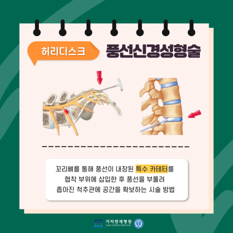 보존적치료로 호전이 되지 않을 땐 보다 적극적인 치료가 필요한데요. 풍선신경성형술과 같은 시술부터 미세현미경수술, 척추내시경 등 수술적인 치료를 고려해볼 수 있습니다. ‘무조건 시술이 필요하다, 수술을 해야 한다’가 아니라 환자 개개인의 상태에 따라 적절한 치료법을 결정하는 것이 중요하며 김포가자연세병원에서는 되도록이면 비수술적인 방법을 우선적으로 진행함으로써 환자분들의 부담을 줄여드리고 있습니다.