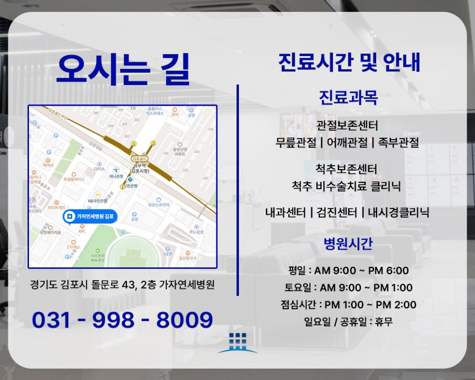 이 외에도 사우동신경외과 가자연세병원은 통증의 원인을 분석하고 생활습관 교정을 통해 재발을 방지하고 근본적인 통증제거를 목표로