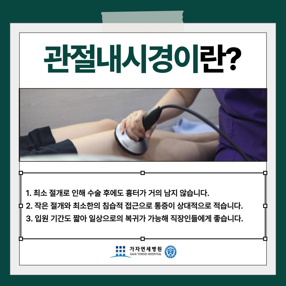 비수술적 치료에도 불구하고 증상이 악화되거나, 통증이 매우 심해 일상생활이 불가능할 정도라면 수술적 치료가 필요할 수 있는데요. 이때 많이 활용되는 방법 중 하나가 관절내시경 수술이죠.