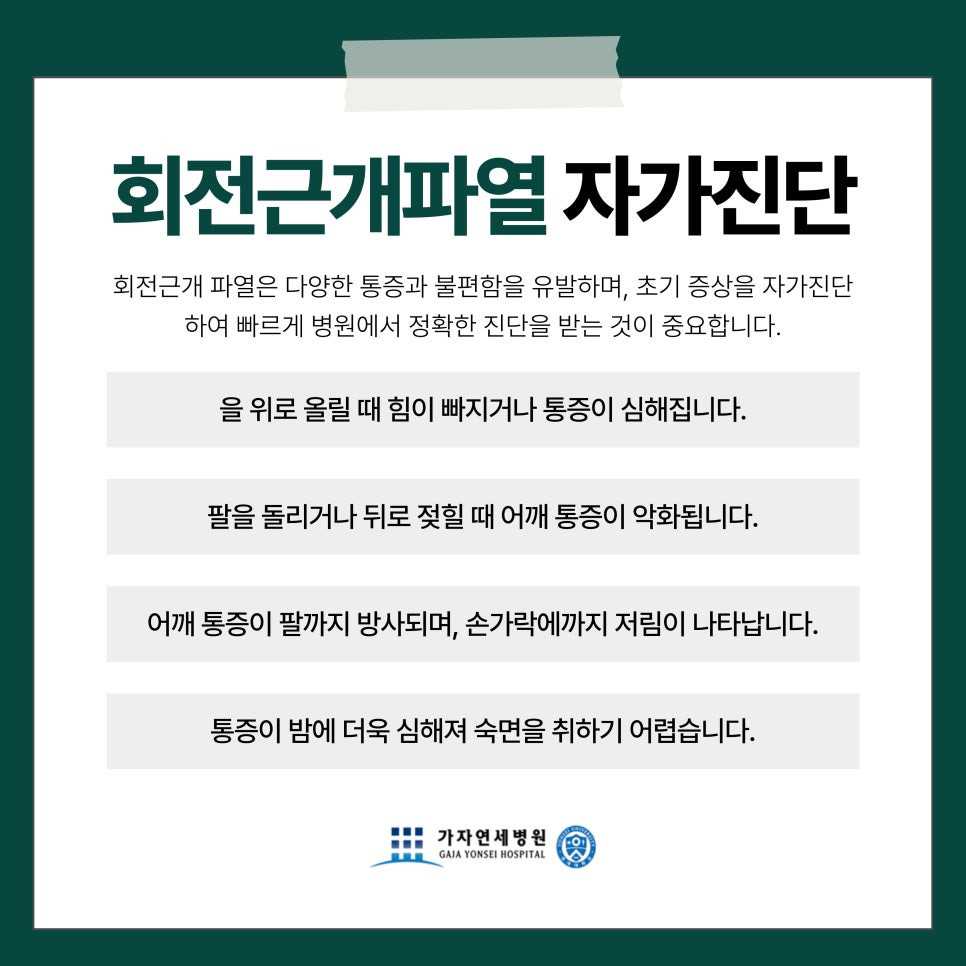 회전근개 파열은 다양한 통증과 불편함을 유발하며, 일상생활에 큰 불편을 초래할 수 있는 질환입니다. 초기 증상을 자가진단하여 빠르게 병원에서 정확한 진단을 받는 것이 중요합니다.
