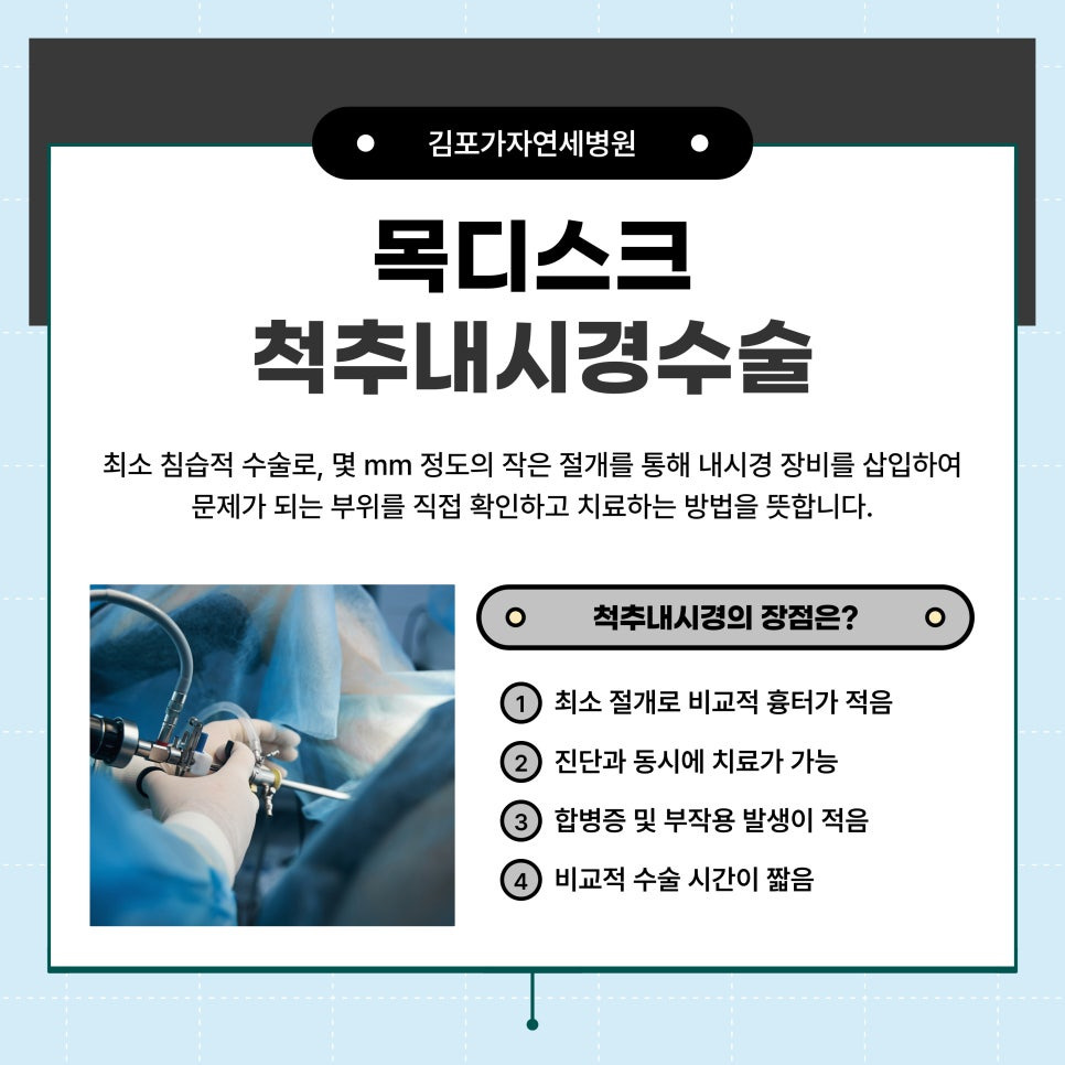 하지만 증상이 심각하거나 비수술적 치료에도 호전되지 않는 경우에는 척추내시경 수술을 고려할 수 있어요. 파주정형외과 김포가자연세병원의 척추내시경은 1CM 이하의 작은 절개를 통해 초소형 내시경과 특수 의료 기구를 병변 부위에 삽입하여 모니터를 통해 병변을 실시간으로 관찰하면서 수술을 진행하는 방식을 뜻해요.