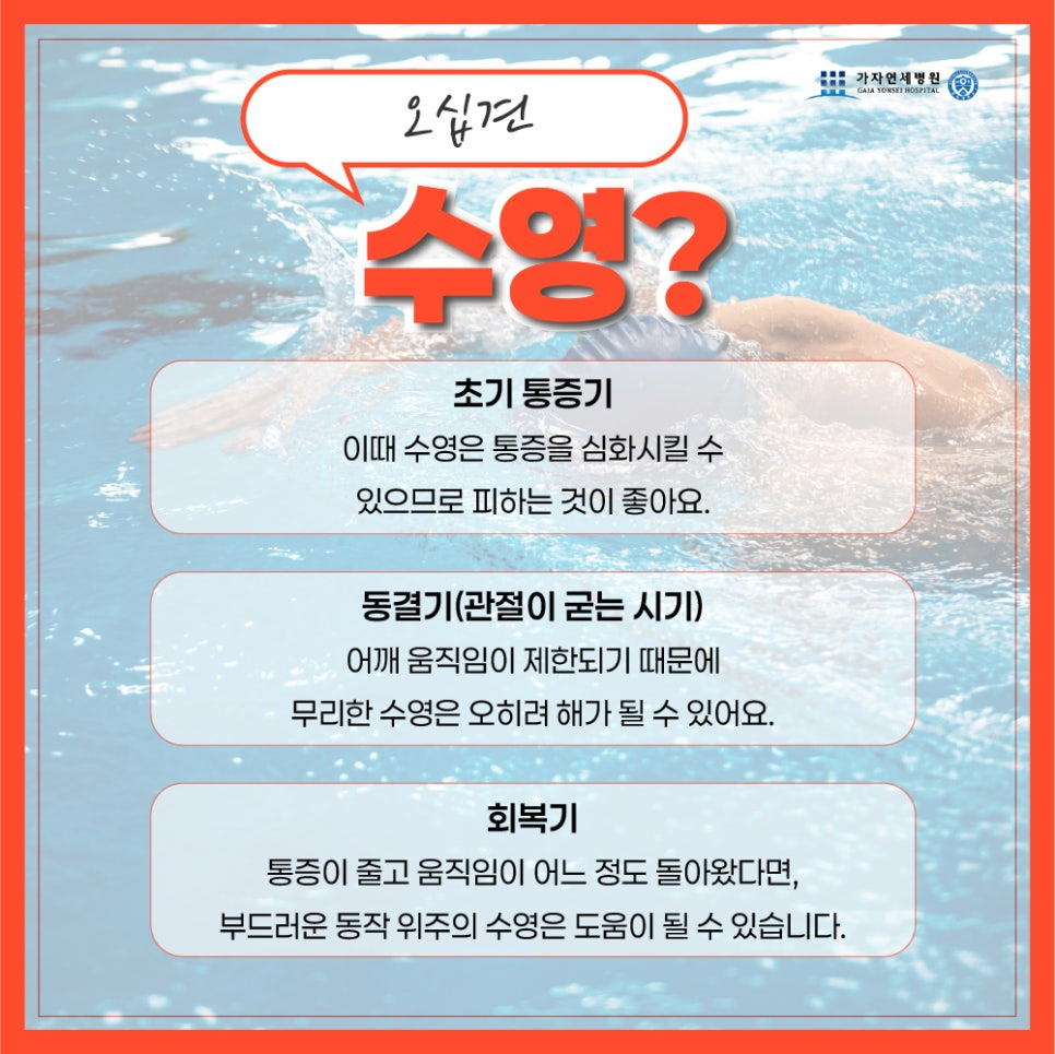 오십견이라고 해서 무조건 수영이 안 되는 것은 아니에요. 회복 단계에 접어들었다면, 무리가 가지 않는 범위에서 천천히 물속 운동을 시작해보는 것도 좋습니다. 다만 초기나 중기에는 통증을 악화시킬 수 있으므로 반드시 전문의 진단을 받은 뒤 운동을 결정하세요.