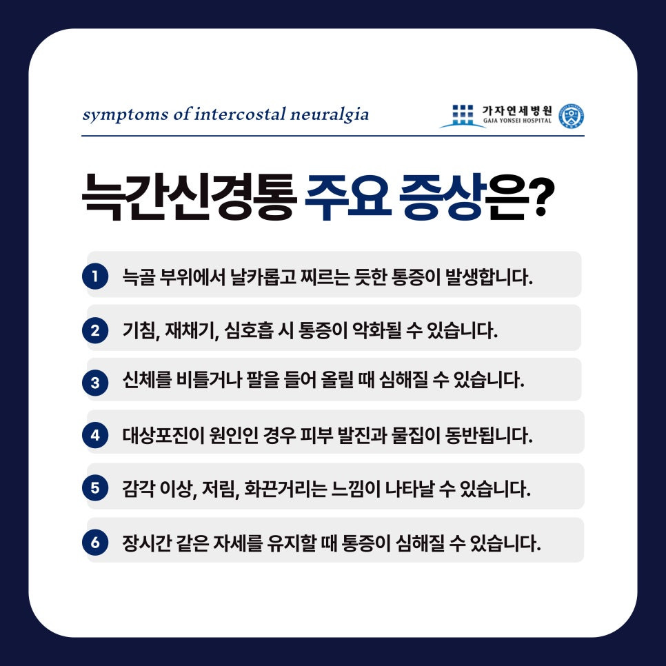갑작스럽게 가슴 옆구리나 등 부위에 찌릿한 통증이 느껴졌던 경험, 있으신가요? 심장이나 폐 문제인 줄 알고 놀라서 병원을 찾는 분들도 많지만, 의외로 신경계 질환인 '늑간신경통'인 경우가 많아요.