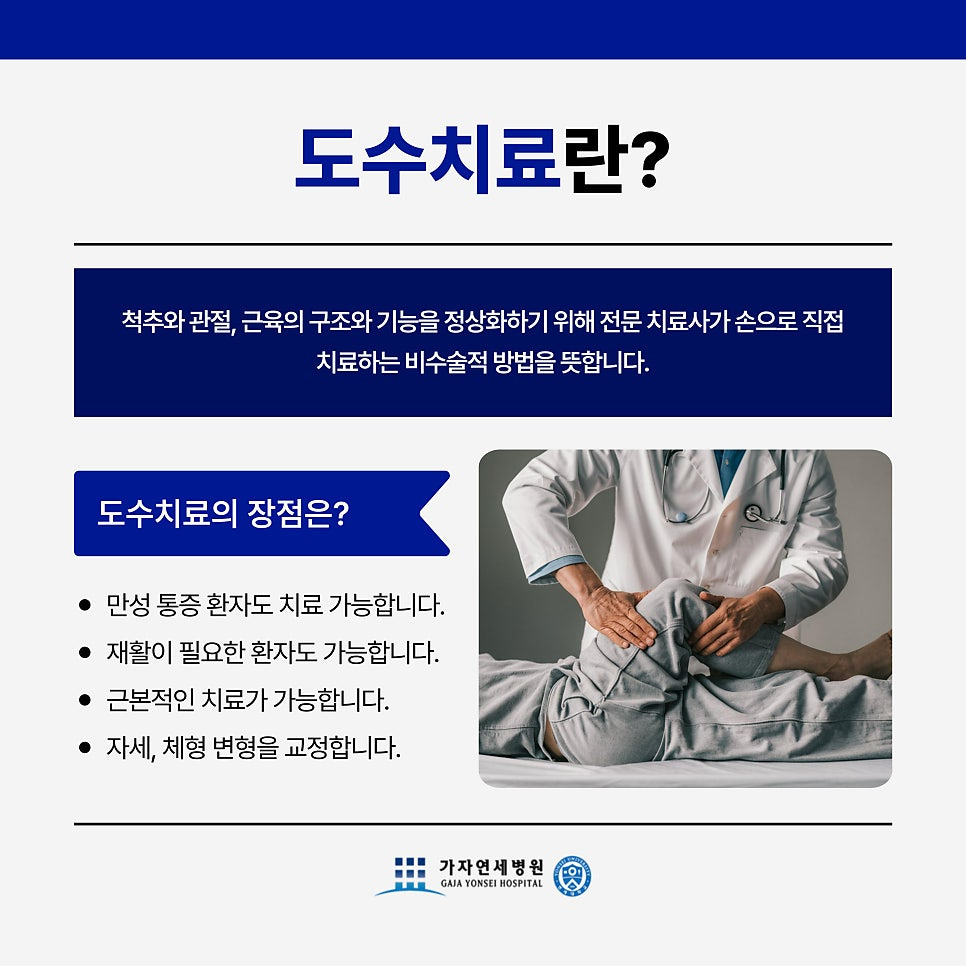 도수치료는 숙련된 치료사가 손을 이용하여 관절과 근육을 직접 교정하고 움직임을 회복시키는 치료 방법입니다. 단순한 마사지가 아닌, 관절의 움직임을 정상화하고 근육 밸런스를 맞춰주는 치료이기 때문에 통증 완화와 기능 회복에 효과적일 수 있습니다.