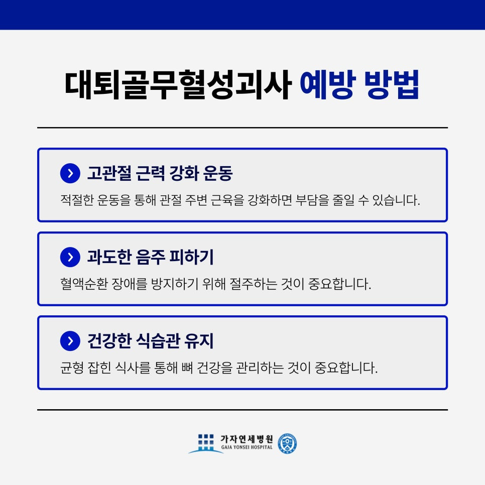 대퇴골무혈성괴사는 예방 관리가 중요한 질환입니다. 다음과 같은 생활습관이 도움이 됩니다.