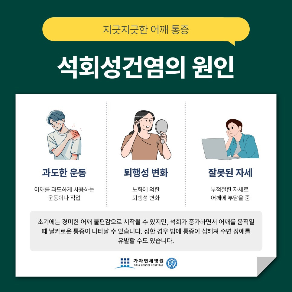 장시간 컴퓨터 작업, 팔을 머리 위로 올리는 활동, 무거운 물건을 자주 드는 경우 등 어깨를 반복적으로 사용하는 습관도 원인 중 하나입니다.