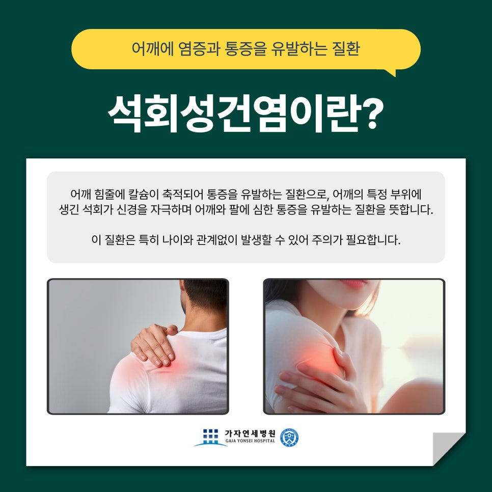 어깨 통증은 현대인에게 매우 흔한 불편 중 하나입니다. 특히 컴퓨터나 스마트폰 사용 시간이 늘어나고, 활동량은 줄어드는 생활 습관 속에서 어깨 주변 근육과 힘줄에 무리가 가면서 다양한 질환이 발생하고 있습니다. 그중 대표적인 질환 중 하나가 바로 석회성건염입니다. 석회성건염은 단순한 근육통과 달리 힘줄에 석회가 침착되면서 나타나는 질환으로, 증상이 심해질 경우 일상생활에 큰 제약을 주게 됩니다.