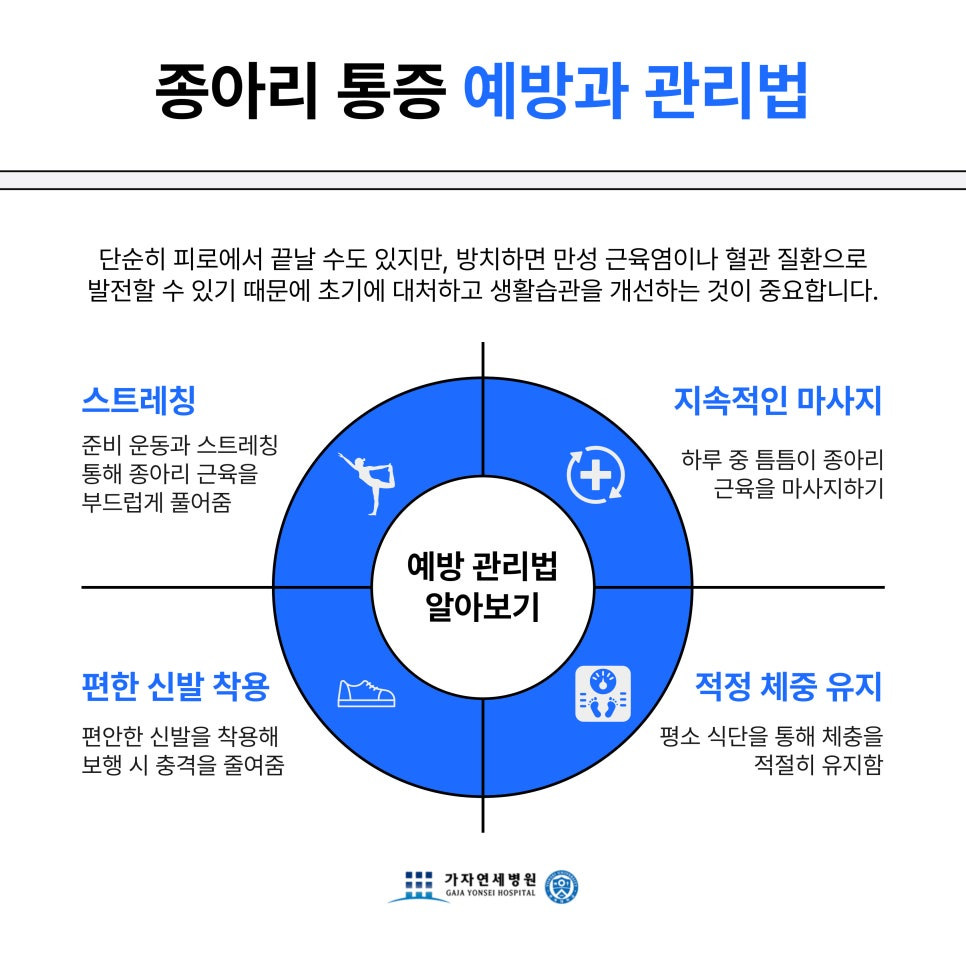 종아리통증을 예방하려면 생활 습관 관리가 무엇보다 중요합니다.