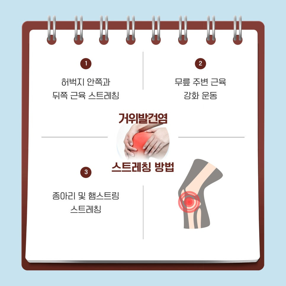 무릎 안쪽 통증이 반복되거나 계단 오르내릴 때 불편함이 지속된다면 거위발건염을 의심하고 조기에 진단과 치료를 받는 것이 중요합니다. 또한 스트레칭과 생활습관 개선을 통해 근육과 힘줄의 균형을 유지하면 재발을 예방할 수 있습니다.