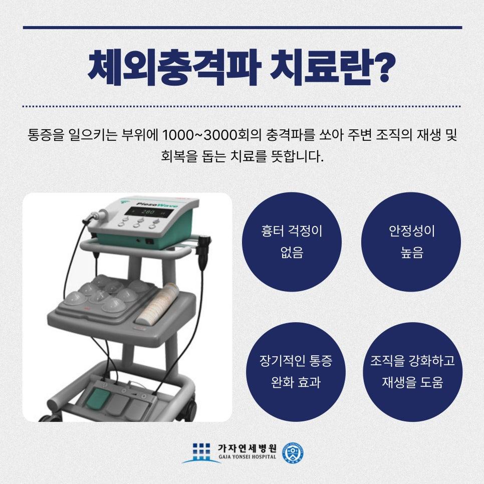 김포가자연세병원은 아킬레스건염 환자에게 체외충격파 치료를 사용해 증상 완화를 기대할 수 있습니다. 체외충격파란, 고강도 초음파를 전용 기기를 사용해 병변 부위에 충격파 형태로 전달하는 것입니다. 충격파가 손상된 힘줄에 자극을 주면서 재생을 촉진한다는 장점이 있습니다.