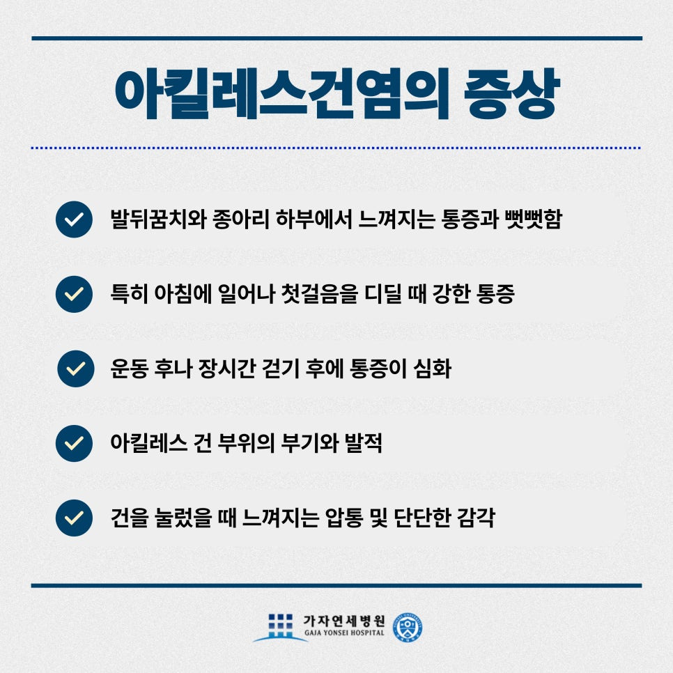 하지만 반복적인 힘이 가해지거나, 부하가 많아지면 아킬레스건에 염증이 생기는 아킬레스건염이 발생할 확률이 커집니다. 아킬레스건염은 활동이 잦은 운동선수에게도 발생할 수 있지만, 선천적인 신체 특성으로 인해 아킬레스건에 부담이 많이 가는 경우도 있습니다.