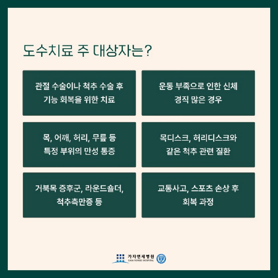 도수치료는 골반 통증 외에도 다양한 부위의 질환에 적용이 가능한 것이 대표적인 장점이에요. 근골격계 질환이 자주 발생하는 어깨, 허리, 손목, 발목, 무릎 등 다양한 부위의 만성 통증과 불균형을 완화할 수 있고, 수술 후 재활치료로도 사용할 수 있어요. 김포가자연세병원은 1:1 전담 도수치료사가 개인 도수치료실에서 치료를 진행하니 검사와 치료를 원하신다면 방문해 주세요.