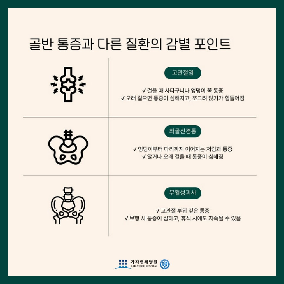 그만큼 골반과 골반 주변에는 다양한 뼈, 근육, 관절, 인대, 장기가 많기 때문에 골반통증의 원인을 자가 진단으로 밝혀내긴 어려워요. 사소한 통증이라도 정확한 부위와 통증 양상에 따라 의심할 수 있는 질환이 다양하기에 정확한 진단을 받으려면 의료기관을 방문하는 게 좋아요.