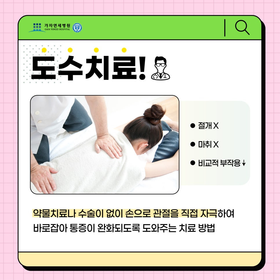 비수술 치료 중 도수치료는 동결기와 해동기에 주로 시행됩니다. 염증으로 인해 굳은 어깨 관절을 손으로 부드럽게 이완해 주고, 어깨의 정상 기능을 재활하는 동작을 돕습니다.