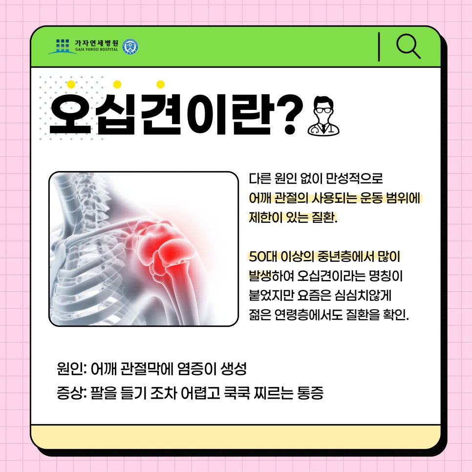 오십견(Frozen Shoulder)은 40대 이상이라면 누구나 걸릴 수 있는 질환입니다. 어깨 관절낭에 염증이 발생하면서 심한 통증과 함께, 관절이 굳게 되면서 전처럼 활동적인 동작이 어려워지게 되죠.