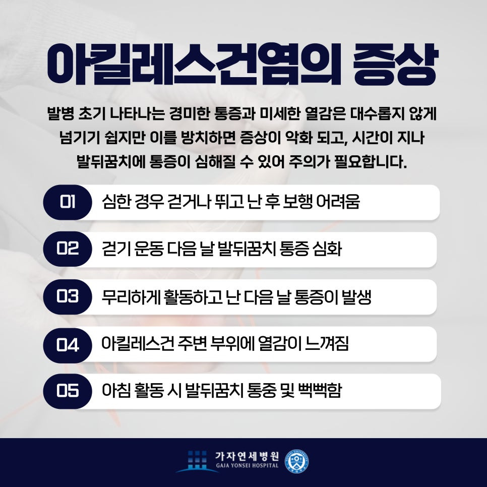 미세손상으로 발생하는 아킬레스건염일 경우, 초기에는 증상이 경미한 것이 특징적입니다. 이는 염증의 부위가 비교적 작고, 심하지 않기 때문입니다. 그러나 이를 적절히 치료하지 않을 경우 염증이 차차 번지며 통증이 심해지며, 실제로 아킬레스건 손상으로 악화할 수 있습니다.