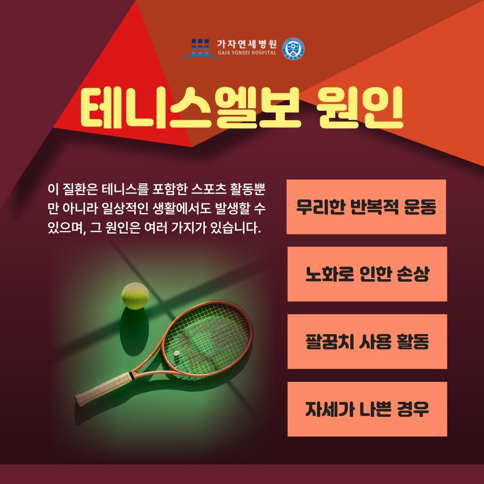 ‘테니스엘보’라고 이름 붙여진 것은 실제 테니스 선수들에게 관측이 자주 되어서지만, 손목을 자주 쓰는 것이 직접적인 원인이기에 스포츠 활동 외에도 사무 작업, 기술직, 미용사 등 다양한 직업군에 발생할 수 있습니다.
