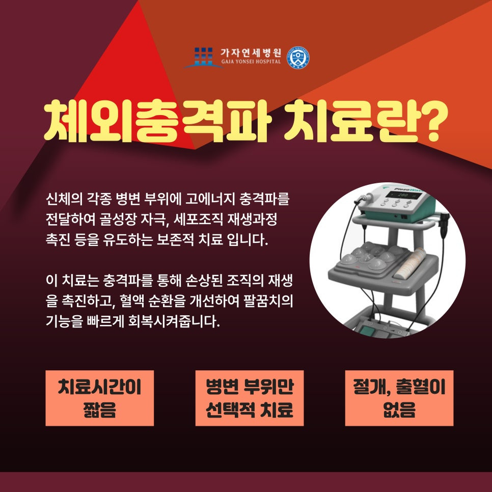 이 중 체외충격파(EWST)는 물리치료에 속하는 보존적 방법입니다. 통증이나 염증이 발생한 조직 부위에 고에너지 충격파를 전달하여 증상을 경감시키는 기전으로 진행됩니다. 테니스엘보 등의 건염의 만성통증 완화에 주로 사용되며, 팔꿈치뿐만 아니라 발목, 허리, 어깨 등 다양한 부위에 적용할 수 있다는 장점이 있습니다.