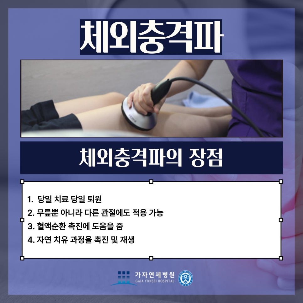 체외 충격파 치료는 통증을 일으키는 부위에 충격파를 쏘아 주변 조직의 재생 및 회복을 돕는 치료에요. 통증 감소뿐만 아니라 기능 회복을 도와주어 양방의 비 수술 치료법으로 많이 사용되고 있는 치료입니다. 주변 조직과 뼈를 활성화하여 통증을 감소시킬 수 있을 뿐만 아니라 피부의 깊숙한 곳까지 침투하여 빠른 회복을 할 수 있어 많은 환자분들에게 선호를 받고 있는 치료법이에요.